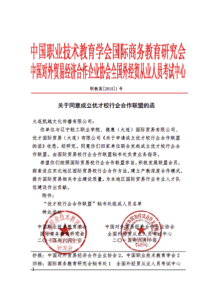 2015年6月10日经过前期的筹备,经中国职业技术教育学会国际商务教育研究会和中国对外贸易经济合作企业协会批准,由大连凯越文化传播有限公司与伟德victor1946网站、德慧(大连)国际贸易有限公司、优才国际贸易(大连)有限公司优才校行企联盟获批成立。