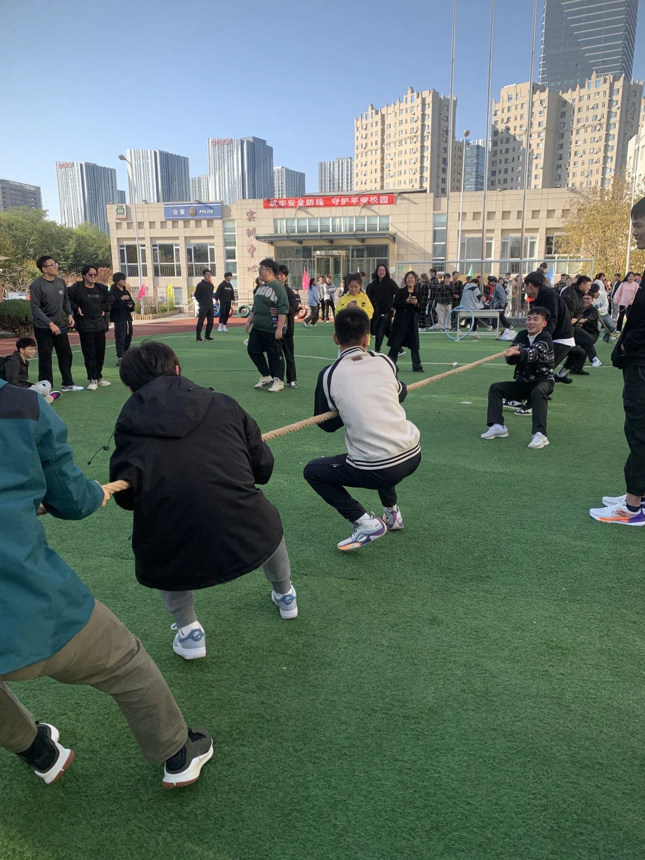 拔河比赛将本次的趣味运动会的气氛推向高潮。双方队员紧握绳索,身体后倾,这不仅是力量的较量,更是团队团结精神的体现。场上参赛者奋力“拉扯”,场下同学们高声呐喊助威,比赛激烈而精彩。