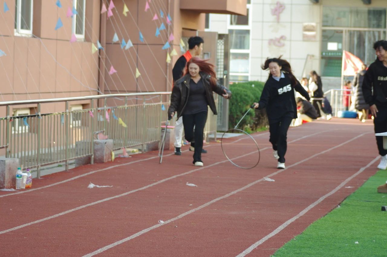 “趣味接力”作为运动会的压轴项目,体现了团队力量与速度的结合。第一棒是“滚铁圈”,第二棒是“穿梭指压板”,第三棒是捏鼻子转十圈然后定向跑,第四棒是“下蛋”,比赛在一片加油呐喊与欢声笑语中走向尾声。