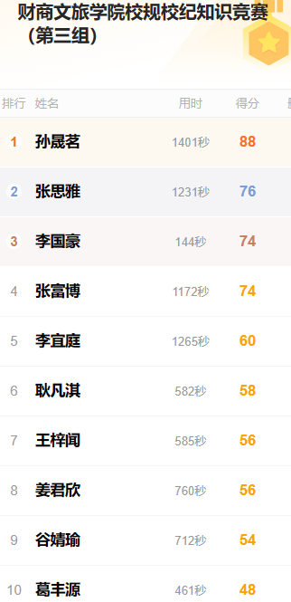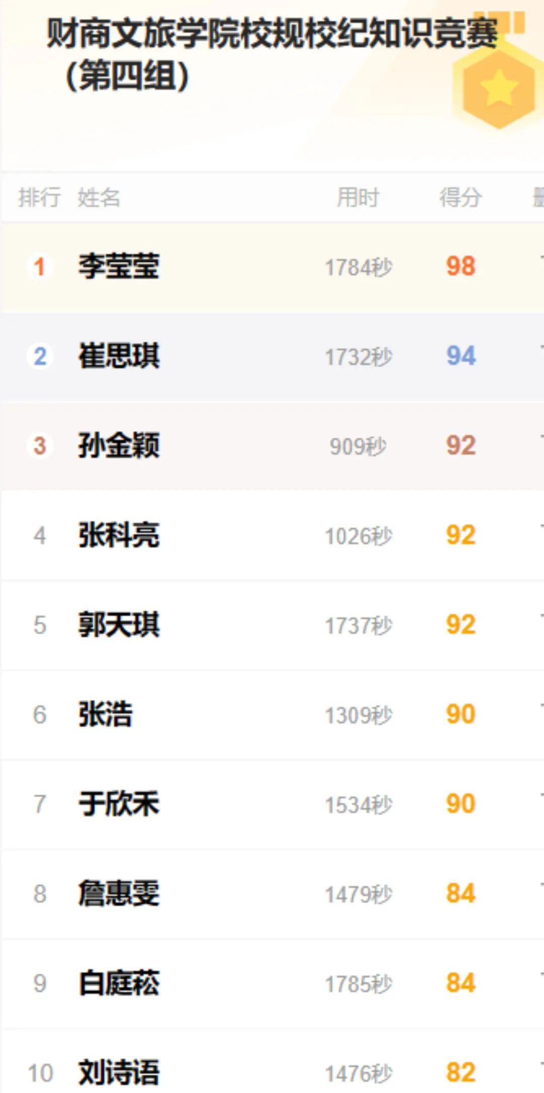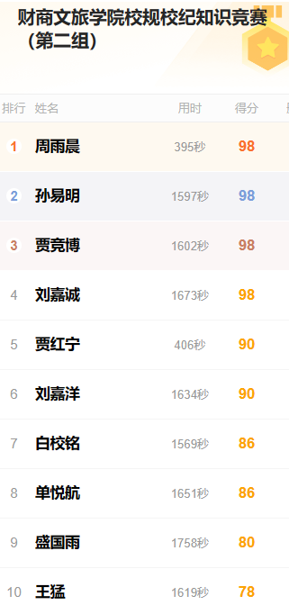 通过这次竞赛,同学们深刻地体会到,校规校纪不仅仅是一条条规定,更是引领我们成长、塑造良好品德和行为习惯的重要指南。此次线上竞赛,公司结合专业共分为五组,每组的前10名成绩和获奖情况如下。