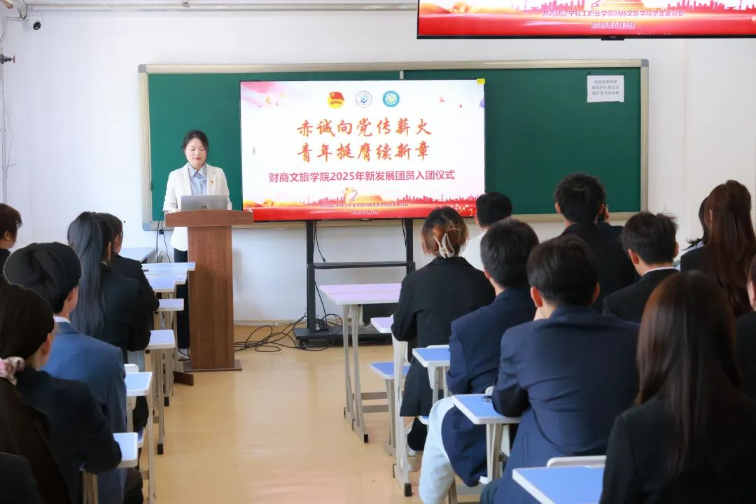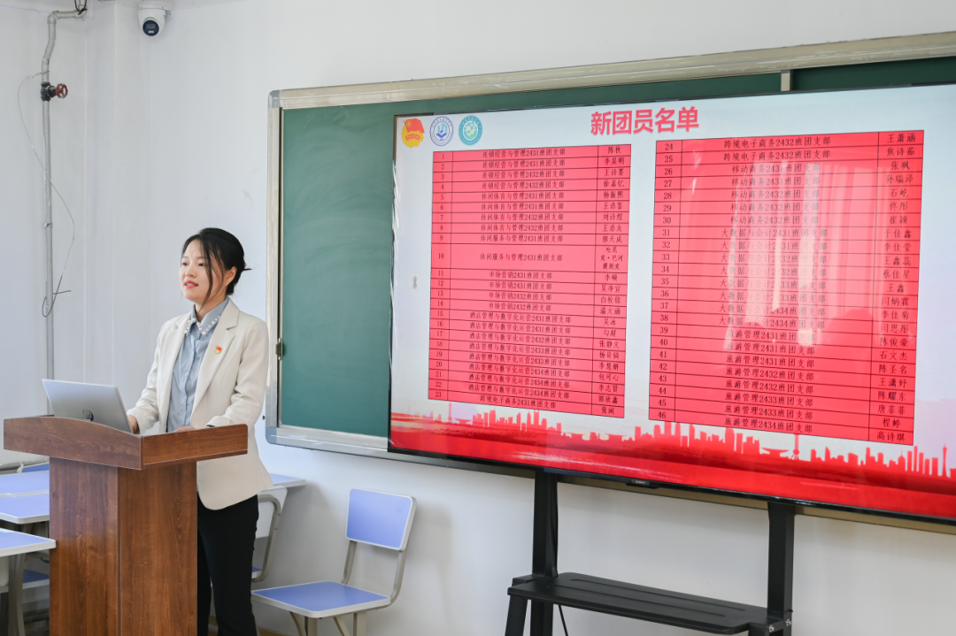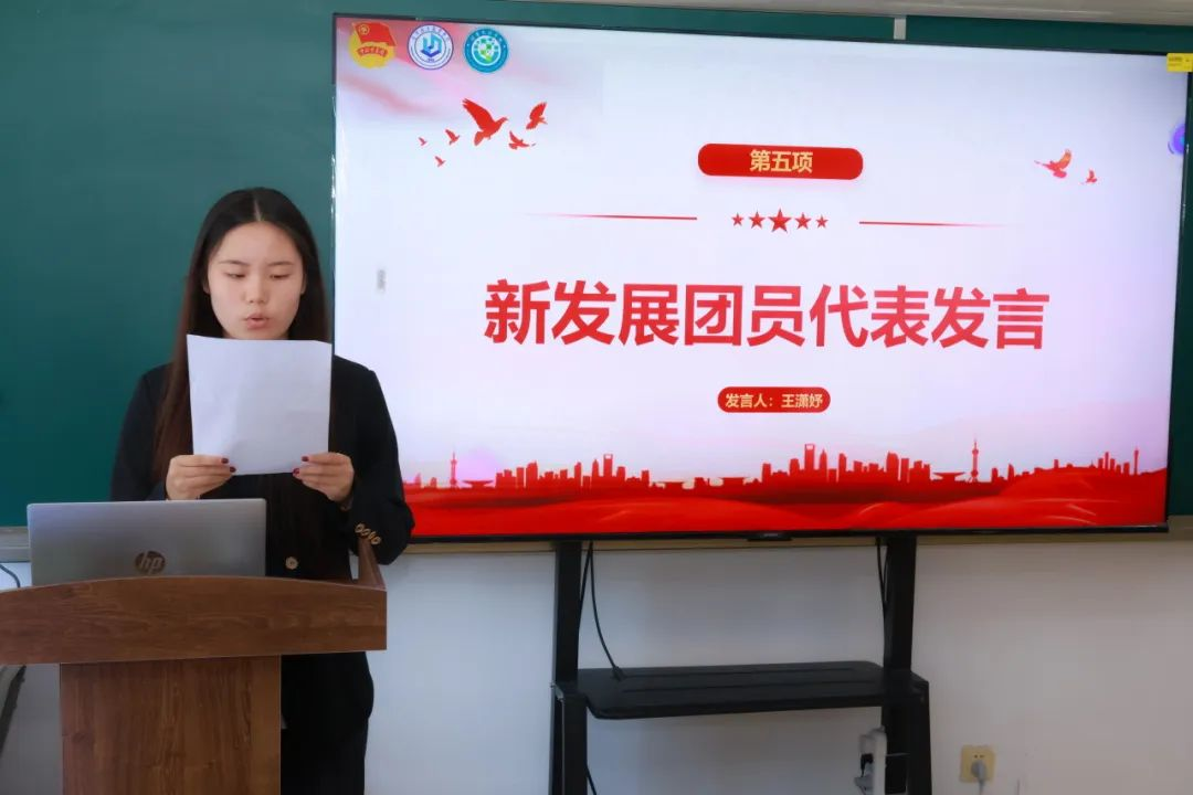 新团员代表、旅游2432班王潇妤分享了她的心声:“戴上团徽的这一刻,我深感责任在肩。正如习近平总书记所强调,新时代青年要立志做有理想、敢担当、能吃苦、肯奋斗的好青年,大一的学习生涯即将结束,我们要反思不足,积极投入学习与社会实践。未来,我会以更高的标准要求自己,用行动证明青春的力量!”
