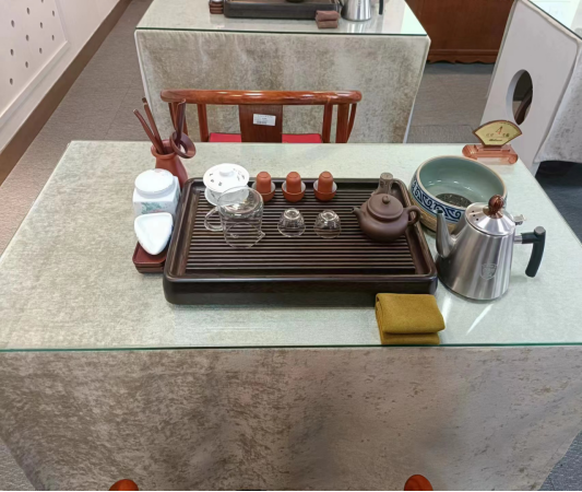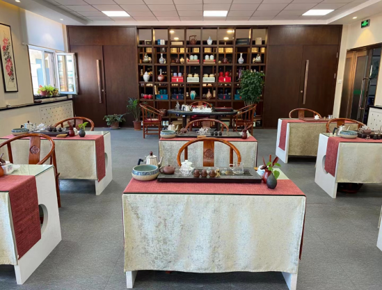 茶艺实训室面积约200余平方米,可满足60名员工同时使用。室内设备配置齐全,拥有多媒体教学设备、茶桌椅、各式茶盘、饮水机、各类茶具等设备设施。可以满足员工以及企业实训及讲座等。