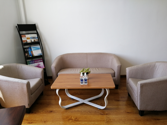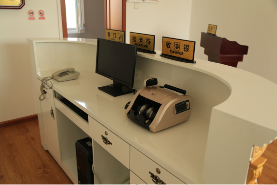客房实训室面积约40平方米,可满足30名员工分组使用。实训设备包括:前台接待台、接待牌、大堂副理桌、沙发、电脑及酒店管理软件、行李车、价目表、不同时区钟表、打印机、点钞机、电话等。